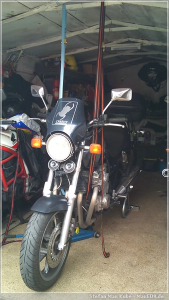 Zunächst mussten wir natürlich wieder das Fahrzeug in Arbeitshöhe bringen, das funktioniert sehr gut mit Motorradheber hinten,, Wagenheber in der Mitte und Spanngurten vorn. Das Mopped hängt dann perfekt und kann bei Bedarf auch noch in der Höhe verstellt werden 😉