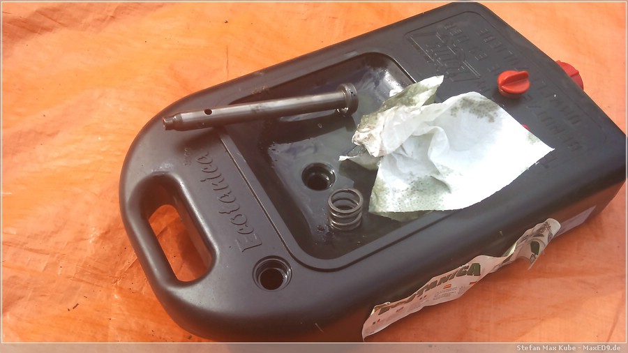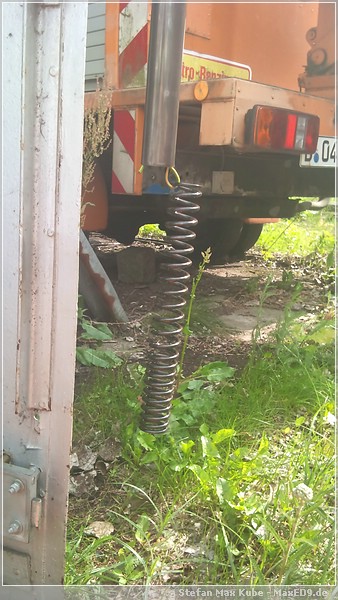 @Jürgen: der aufmerksame Beobachter wird eventuell auch den Ölauffangbehälter (und auch die Plane) auf den Bildern gesehen haben. Natürlich hängen wir die Feder genau darüber auf.