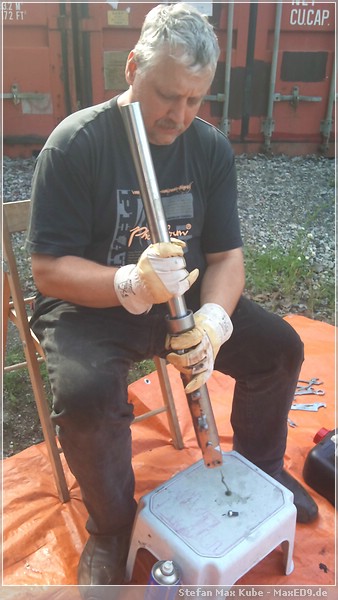 Nachdem die Gabelverschlusssschaube geöffnet ist, kann die Gabelfeder, der Federsitz und die Distanzhülse aus der Feder entfernt und das Öl abgelassen werden. Danach wird die untere Gabelverschlussschraube gelöst und das Dampferrohr mit der Rückprallfeder entnommen. Alles ordentlich abtropfen lassen. In der Zwischen werden Staubkappe und Anschlagring entfernt und dann geht es ans Eingemachte. Mit ein paar ruckartigen Zugbewegungen zieht man das Standrohr aus dem Tauchrohr.