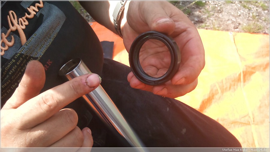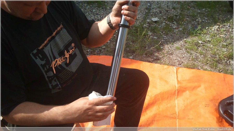 Der Einfachheit haben wir die neuen Dichtringe immer von oben aufgeschoben, zuvor natürlich ein wenig eingefettet, damit es leichter geht. Das Standrohr gut abwischen und den Dichtringsitz im Tauchrohr von Schmutz befreien. Nun kommt das Standrohr wieder in das Tauchrohr und das Dämpferrohr mit der Rückprallfeder kann wieder montiert werden.