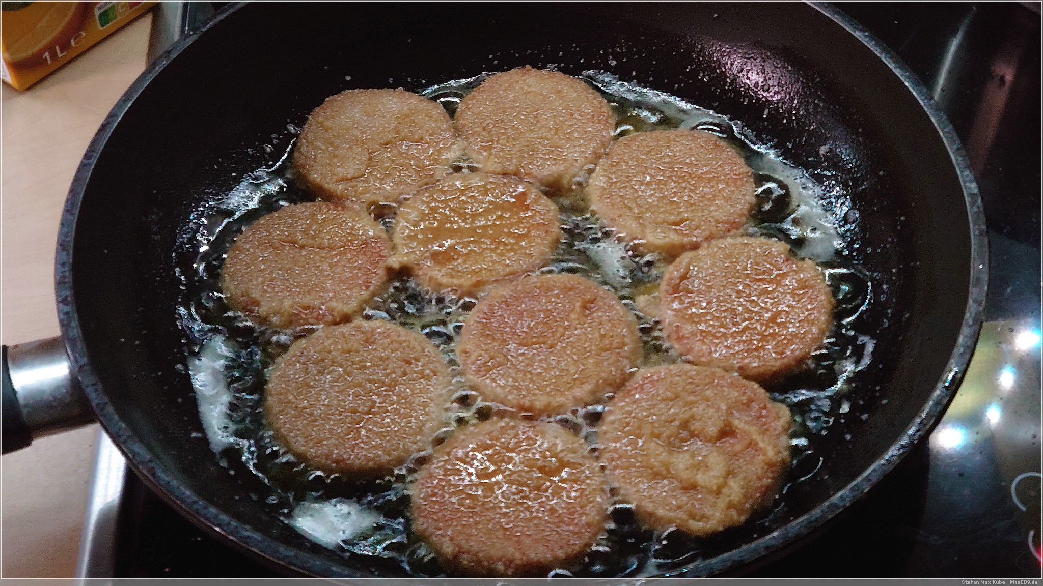 Die panierten Wurstscheiben können dann ganz normal in der Pfanne mit Fett gebraten werden.