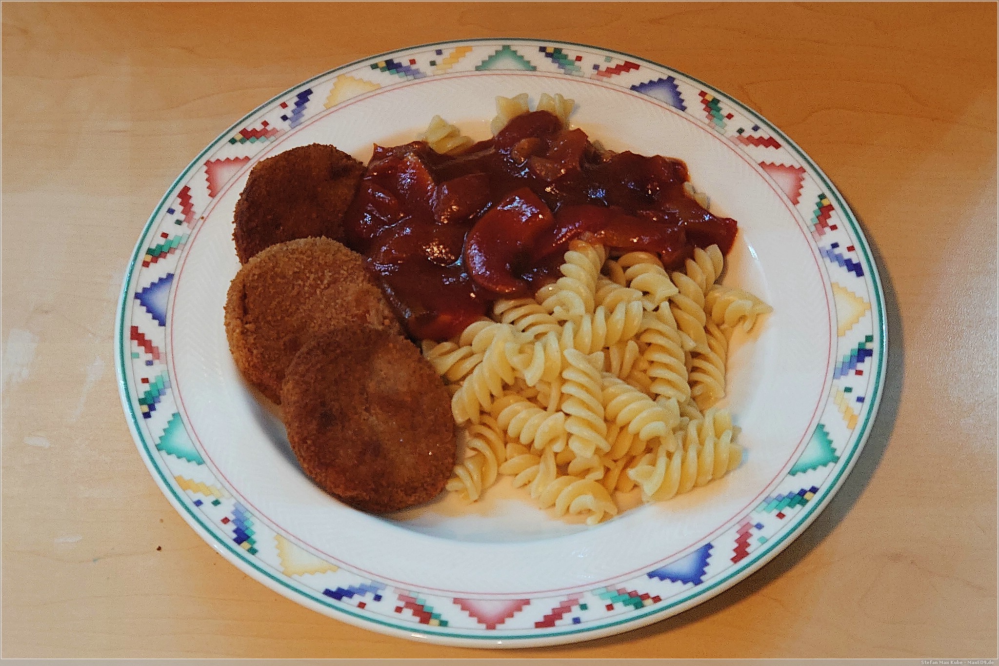 Der ganze Klumpatsch wird dann mit Nudeln und Sauce serviert.