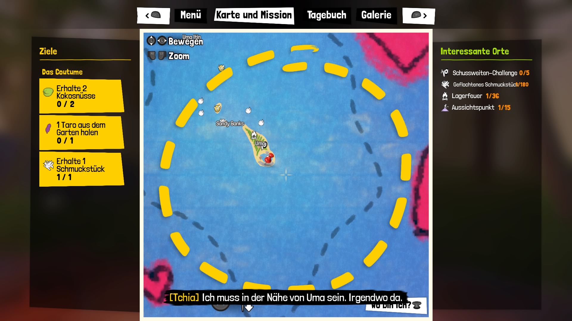 Elemente wie die Rufe an Aussichtspunkten erinnern ein wenig an Assassin’s Creed Synchronisationen, in den weitere Teile der Karte aufgedeckt werden. Apropos Karte, auch in Tchia gibt es natürlich eine Karte, jedoch verzichtet man im Spiel darauf den eigenen Standort direkt zu markieren, so kann man zwar eine Wo-bin-ich-Funktion auslösen, dies zoomt jedoch nur auf den Kartenausschnitt, in dem man sich befindet.