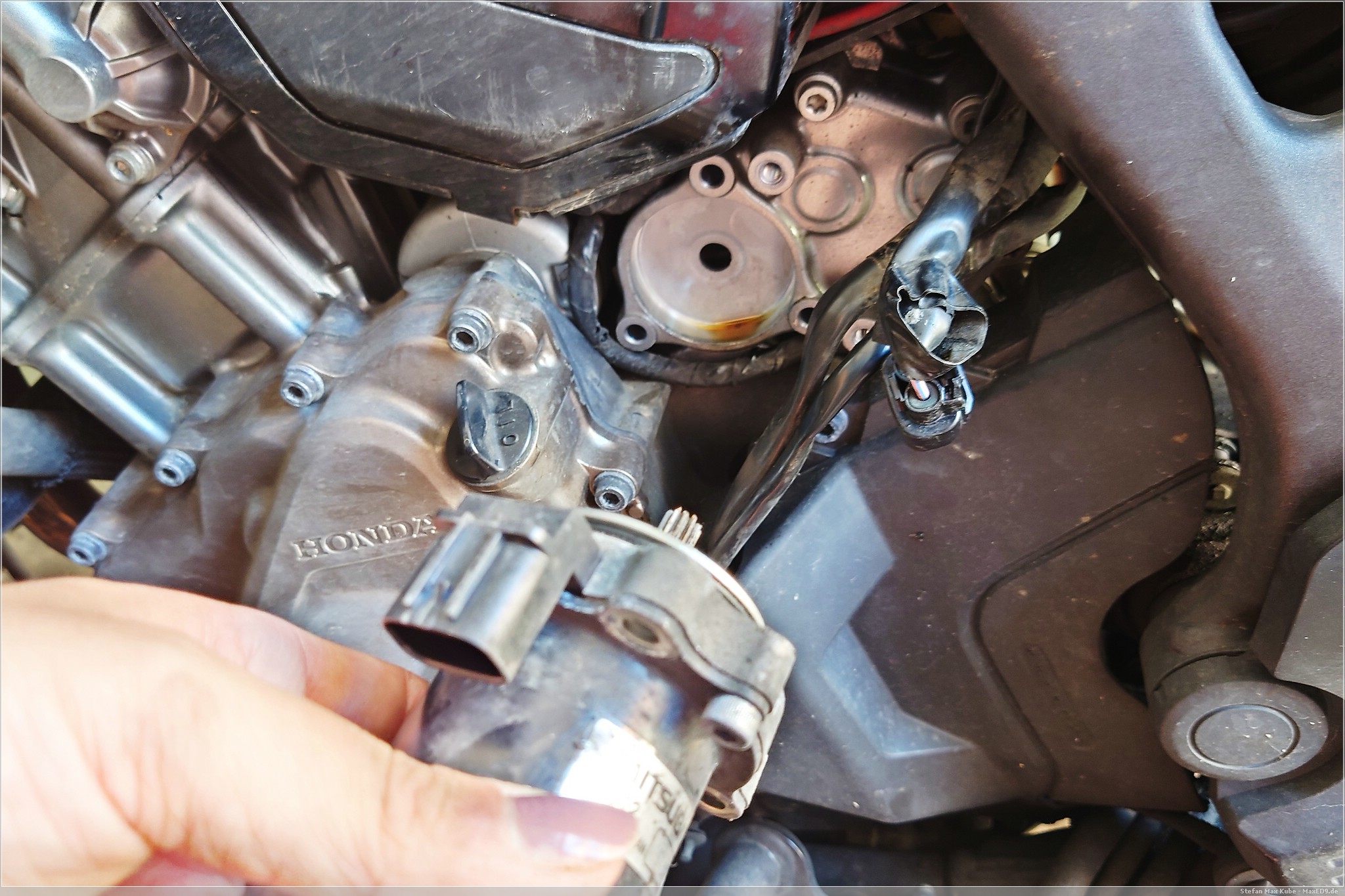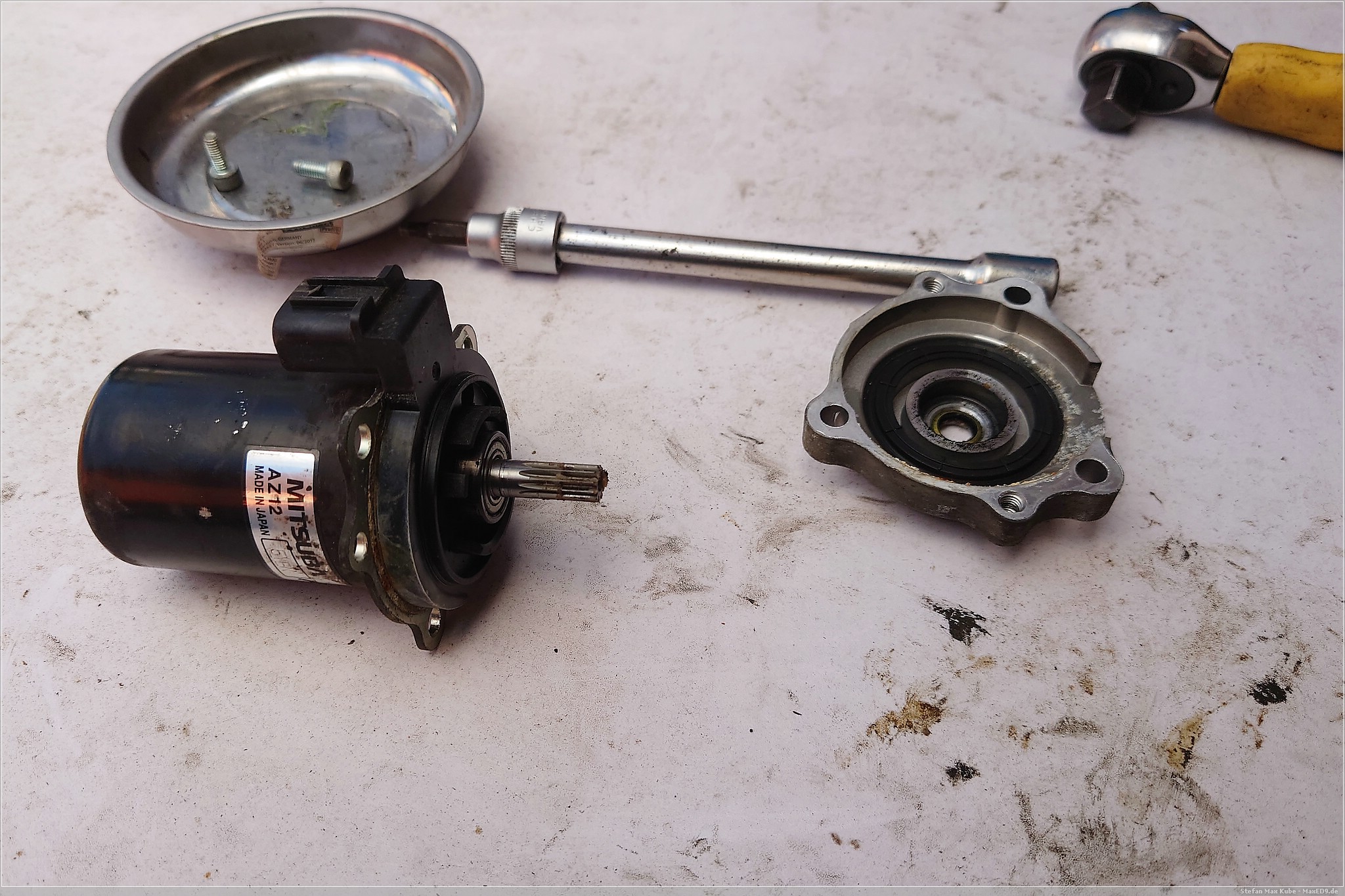 Nachdem die Kunsttoffabdeckung mit einem Inbusschlüssel Größe 5 demontiert ist, entriegelt man den Stecker des Motors und zieht ihn ab. Danach können die 3 T30 Torxschrauben ausgeschraubt und der Motor vorsichtig abgezogen werden. Am Motor ist ein Dichtring, diesen nicht beschädigen. Es kann auch etwas Öl auslaufen, ein Lappen ist hilfreich.