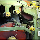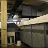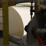 die Ränder der noch feuchten Papierbahn werden mit einem Wasserstrahl abgeschnitten